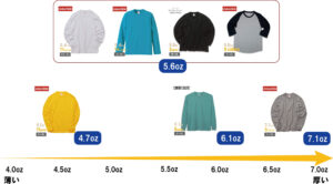 Tシャツの生地の厚さを示すoz(オンス)。詳細はコチラからどうぞ。